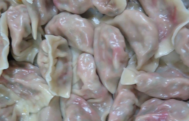 吳月圓老師上週教習的主食是「匏仔火龍果皮(素)水餃」,主要餡料是瓠瓜、香菇、油豆腐、山芹菜,用火龍果皮做色,素臊、薑麻油調味,熟煮的元寶油亮透紅,喜感十足。讓一向對素水餃沒好感的阿北仔吃得撐了還捨不得停筷。(課後心得:蛋奶素的食家不妨在餡料裡加個鹹蛋黃碎末應會有蟹黃餃的味道)
