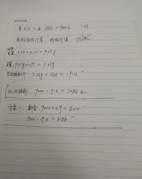 據了解,銷售人員的算賬方式是這樣的:舊款戒指的價值=舊款克重的七五折(5.64+4.03=9.67克×0.75=7.25克)×當日舊金的回收價(264元/克)=7.25×264=1914元;新款戒指是定價商品,男款標價5170元,女款標價3830元,合計9000元;置換貼補差價為9000-1914=7086元。