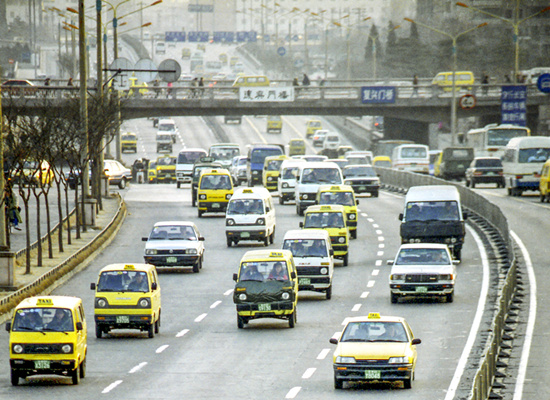1993年12月,北京西二環復興門橋區行駛的黃色麵包出租車,市民稱之為“黃面的”。20世紀八九十年代,北京市機動車保有量不足百萬輛,私家車更是鳳毛麟角。北京市投放大量黃色微型麵包出租車投入運營,由於價格便宜(一元錢一公里),深受市民歡迎。
