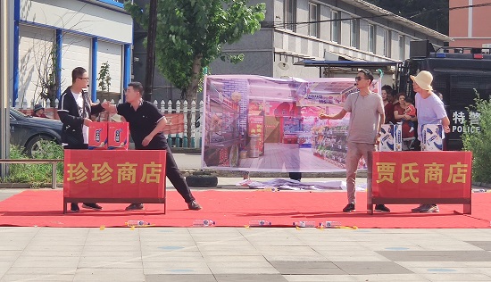8月23日下午,在臨江市江南廣場的,《中國消費者報》記者和森工街道森工社區的300多名居民一起,現場觀看了微話劇《真假六個核桃》的演出。雖然秋老虎雨後發威天氣炎熱,但烈日下的律姿羽和同事們完全入戲,表演起來有板有眼,劇情跌宕起伏,觀眾掌聲雷動。