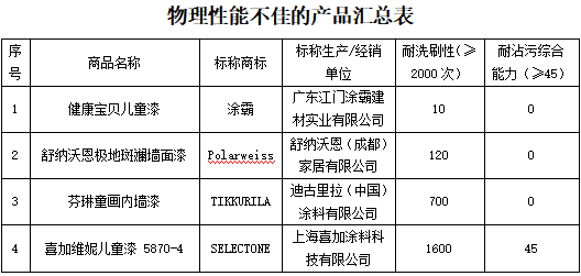 本次比較試驗中分別有4件樣品的耐洗刷性和3件樣品的耐沾污綜合能力較差,其中標稱由廣東江門塗霸建材實業有限公司生產的健康寶貝兒童漆(標稱商標:塗霸;標稱規格型號:A1603),其耐洗刷性僅為10次,耐沾污綜合能力為0,表明其產品不耐臟,不適宜清潔,耐洗滌擦拭的能力較差。