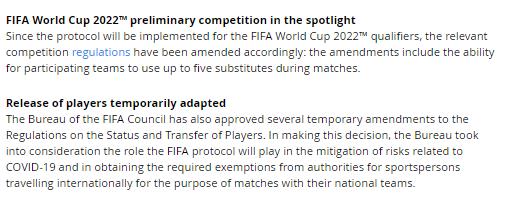 根據公告,鑒於全球疫情因素影響,國際足聯已經批准了關於複賽后國際比賽的相關規定,對2022世界杯預選賽比賽規則作出了相應修改,其中包括比賽中單場最多換5人的規定。