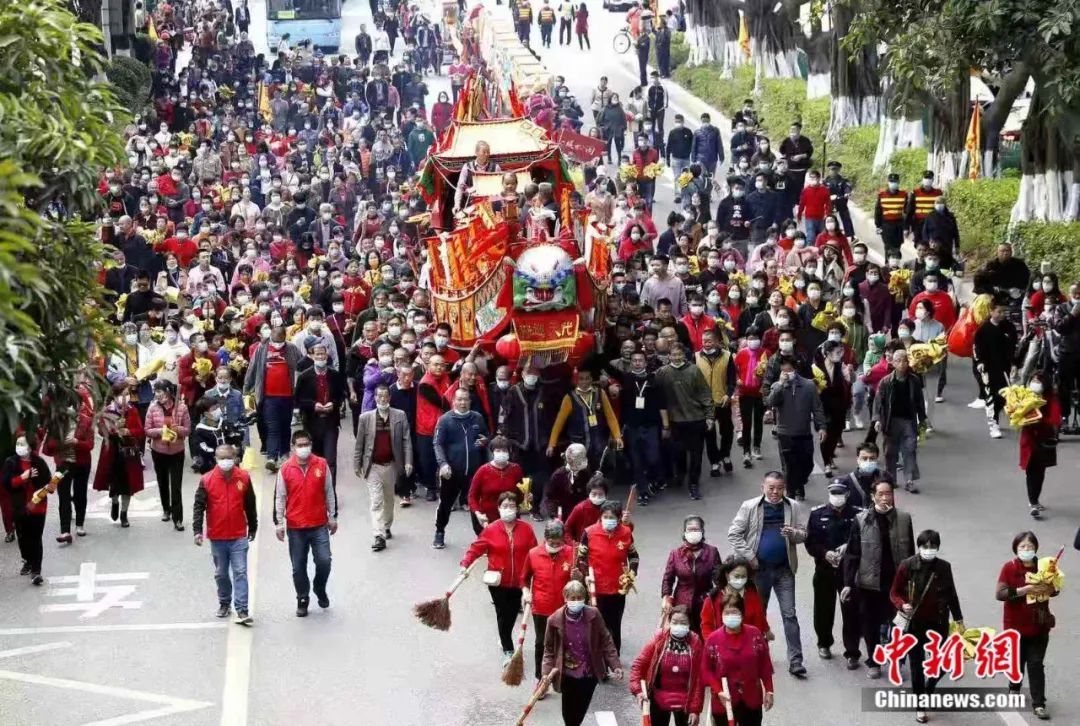 民眾以各種藝陣開道,簇擁着王爺巡安。中新社記者 呂明 攝