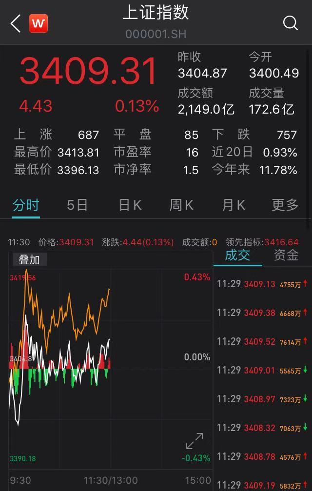 截至午間收盤,滬指報3409.31點,漲幅0.13%,成交額2149.0億元;深成指報13915.70點,漲幅0.19%,成交額2483.16億元;創業板指報2795.04點,漲幅0.34%;上證50指數報3521.50點,跌幅0.51%。