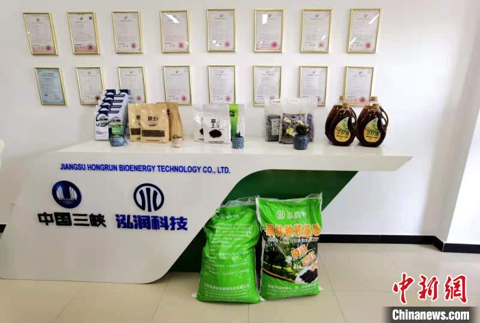 “混搭”的餐廚廢棄物、污泥在工廠內按一定比例進行協同厭氧發酵,產生沼氣、沼液、沼渣。其中,沼氣用於本廠鍋爐后,經提純加壓,輸入市政燃氣管網;沼液用來製作液態肥、化肥;沼渣用作土壤改良、園林綠化、農業種植。圖為變廢為寶的產品。 朱曉穎 攝