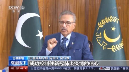 巴基斯坦總統 阿里夫·阿爾維:巴基斯坦和中國進行了新冠疫苗的合作試驗,目前巴基斯坦正在進行疫苗的免費測試,我相信中國生產疫苗更多是為了造福人類,而不是商業盈利目的,我希望我們能研製出有效的疫苗分享給世界人民。