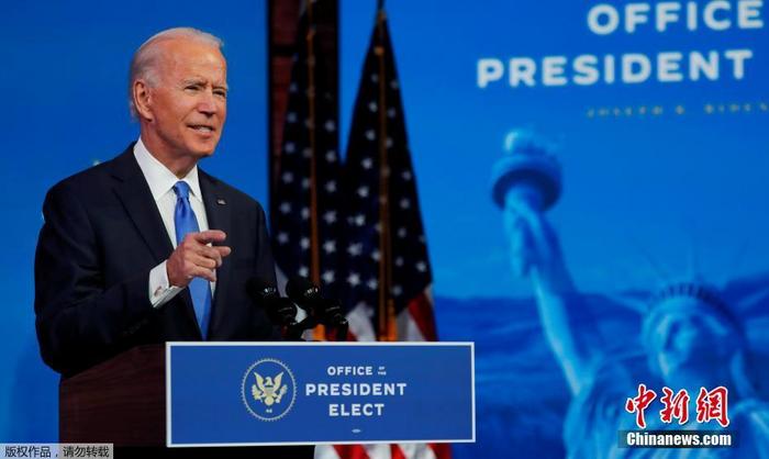 當地時間12月14日,美國當選總統拜登在特拉華州威爾明頓皇后劇院的過渡總部發表電視講話。