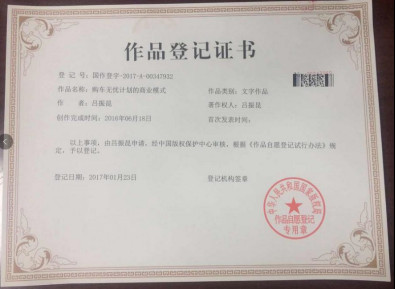 唐山合進商貿有限公司推出的“購車無憂”商業模式,持有國家版權局頒發的知識產權證書。