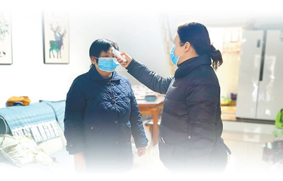 劉珍(右)在社區走訪,為居民測量體溫。 |
