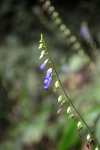 上圖:石鼓盤瀑布停車場走步道往吊橋,步道旁的竹林下方長著一串串紫藍色的唇形花,它的名字叫「尖舌草」。花的下唇伸出如舌尖而得名。