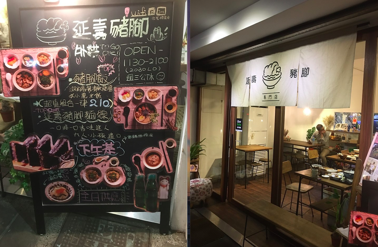 「延壽豬腳」的菜單(左)與店面。(樊祥麟攝)
