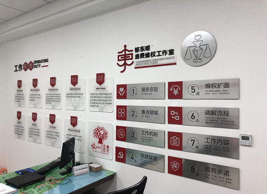 記者走進工作室,赫然發現牆上印着一個紅色的“東”字LOGO,十分搶眼。郁東明說:“上面一橫,是撐起的維權‘保護傘’;底下一橫,就像是一架天平,要求我們在工作中做到公平公正;當中一個‘日’,是提醒我們要不忘初心,日復一日戰鬥在維權一線。”而當問及工作量時,郁東明坦然道:“上半年,工作室一共受理了600餘起投訴,一天最多能接到9起投訴,都習慣了。”