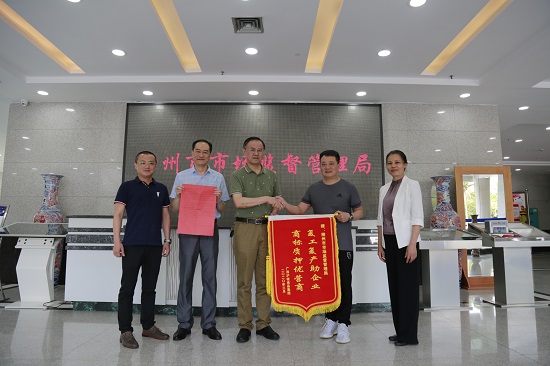 5月8日,廣西滬桂食品集團有限公司董事長羅岸峰(右二)向柳州市市場監管局送錦旗表達謝意。張文韜/