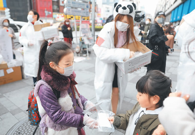 在日華僑華人發起的志願者團體“口罩熊貓行動小組”在日本東京池袋站前向當地民眾免費發放口罩。圖為一名小志願者(左)向當地小朋友發放兒童用口罩。